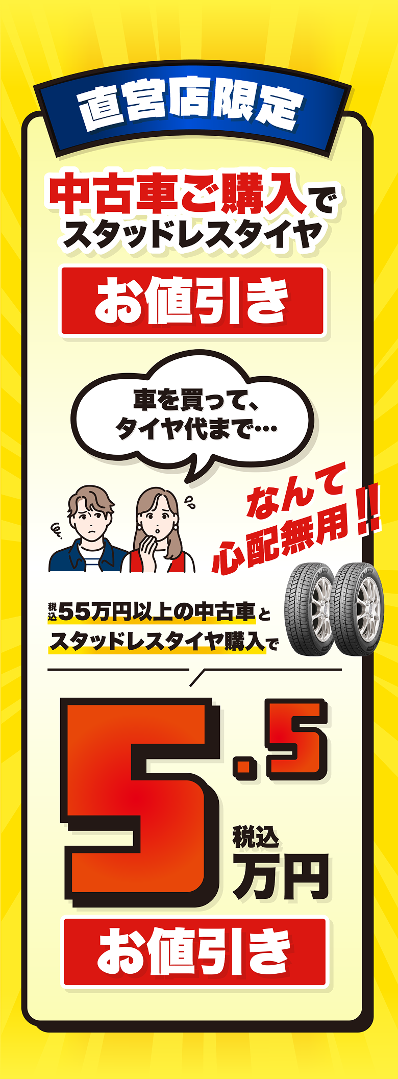 - スタッドレスタイヤについてはホイール(アルミホイール・スチールホイール)とセットでの場合に限ります。