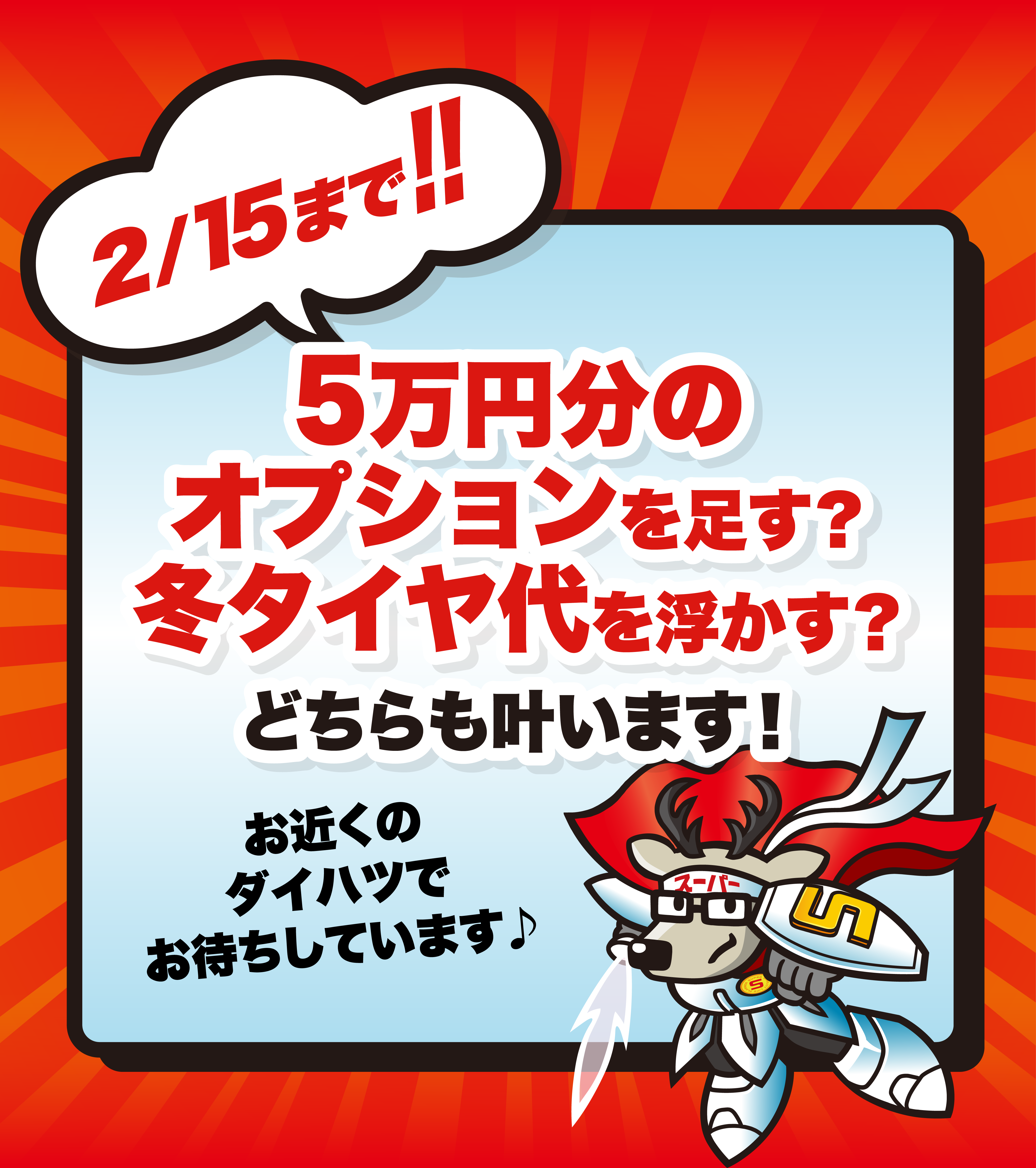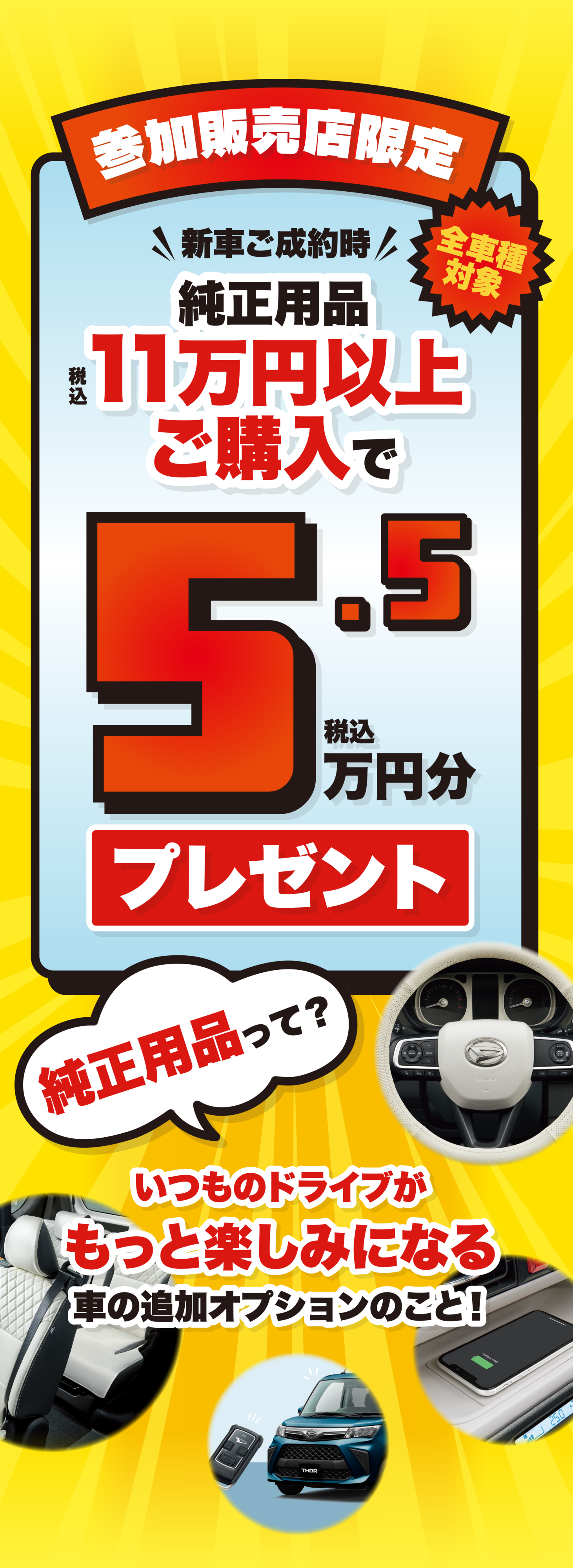 - 2026年2月7日~2026年2月15日までに、ダイハツ製新車と用品110,000円(取付費・消費税込み)分、ワンダフルパスポートをセットでご成約の上、2026年3月31日までに登録・届出いただくことを条件に55,000円(消費税込み)を割引いたします。