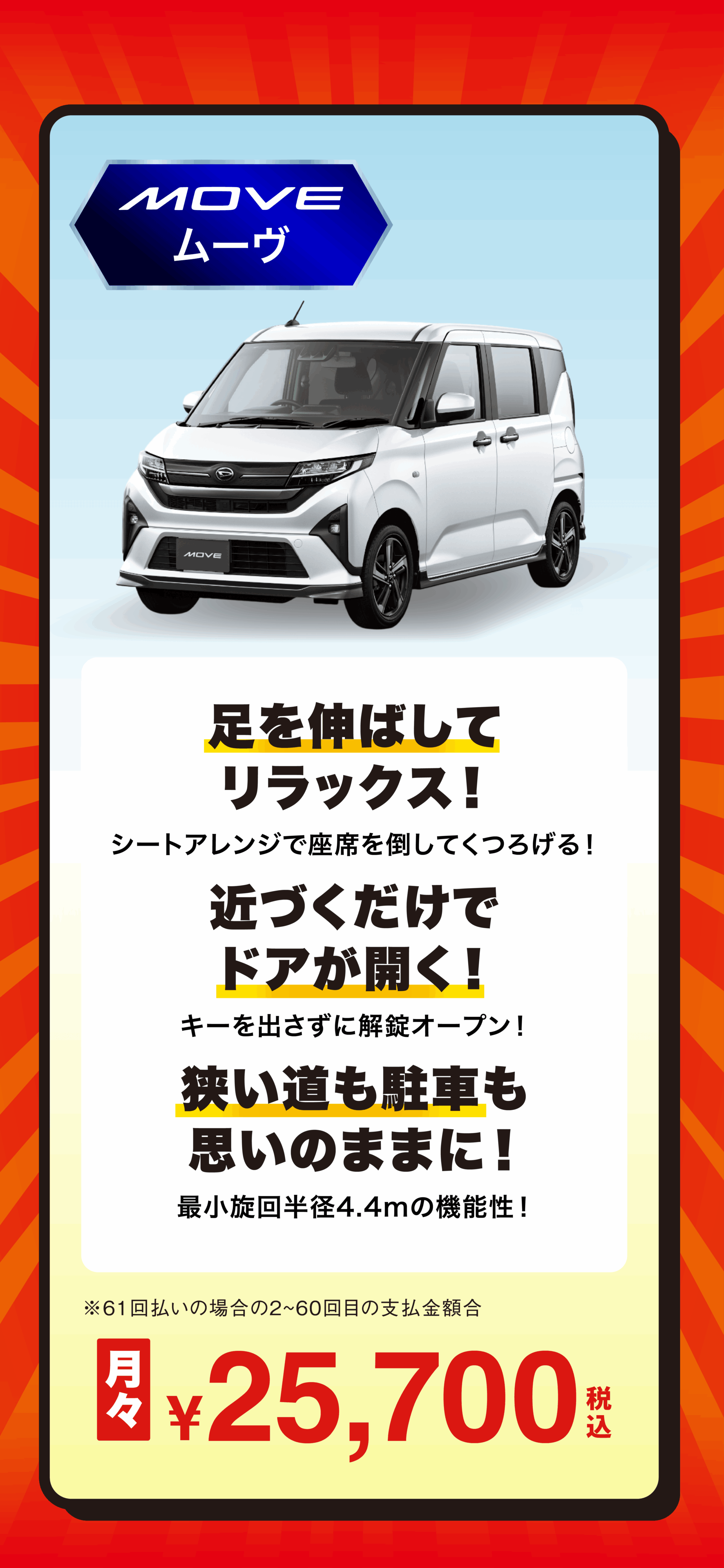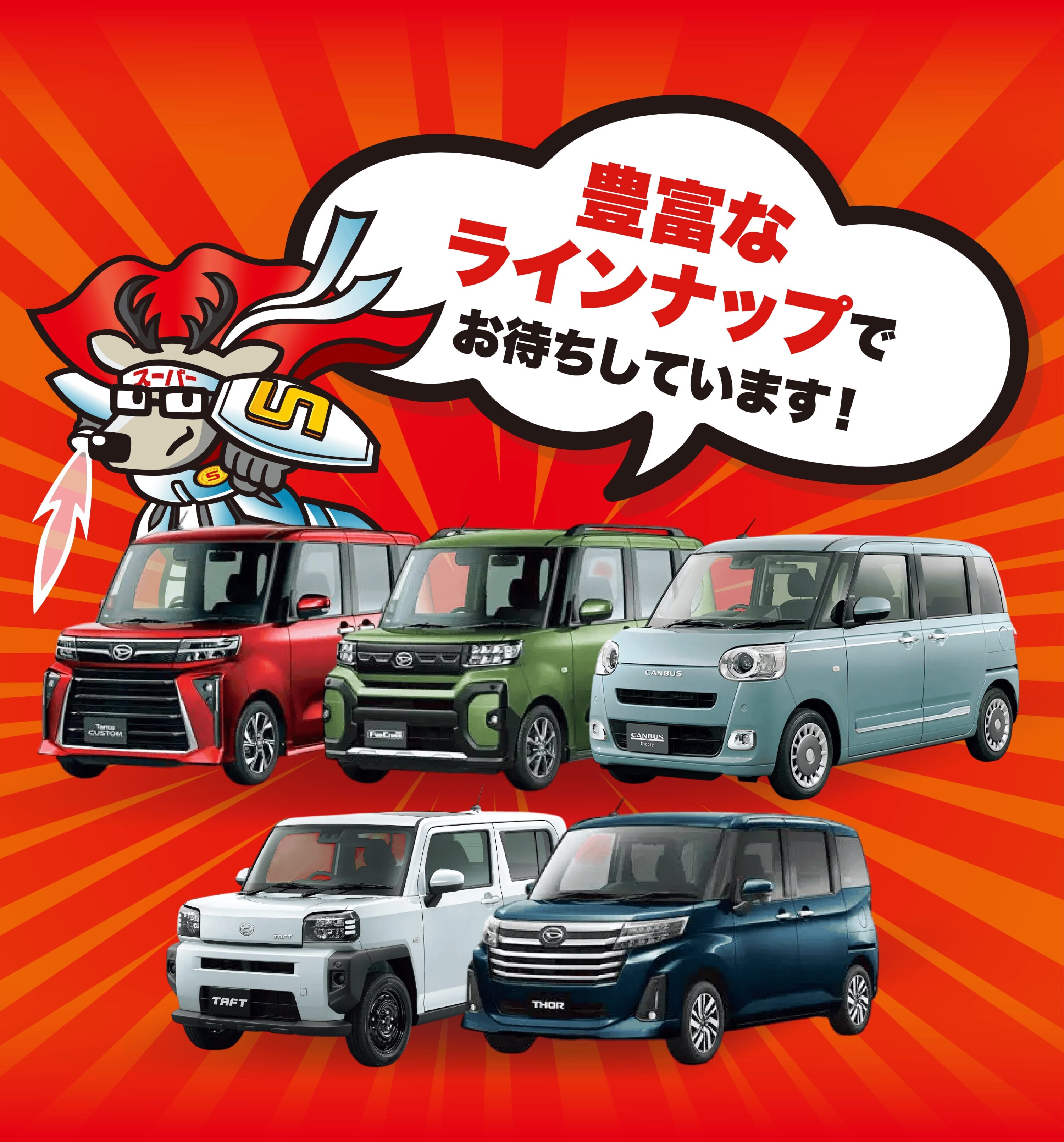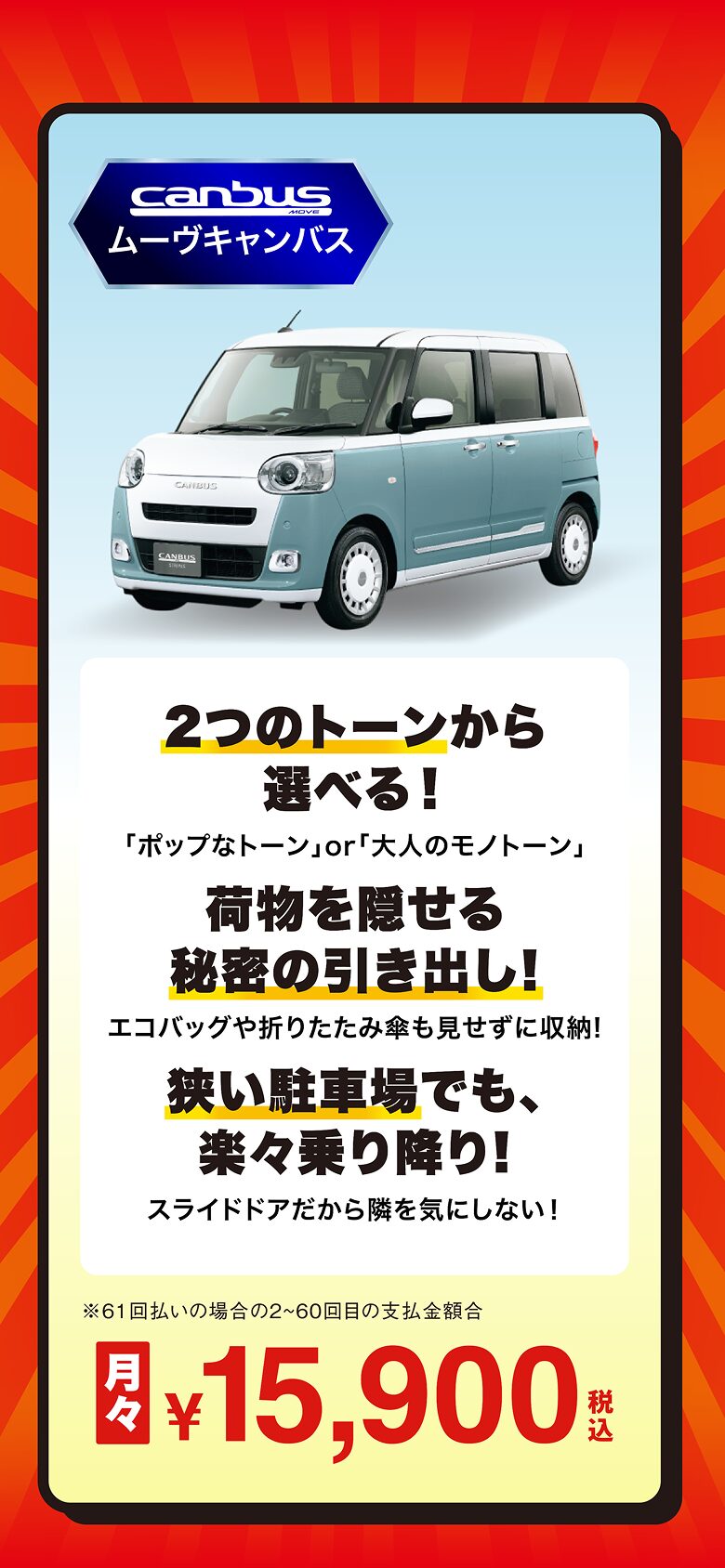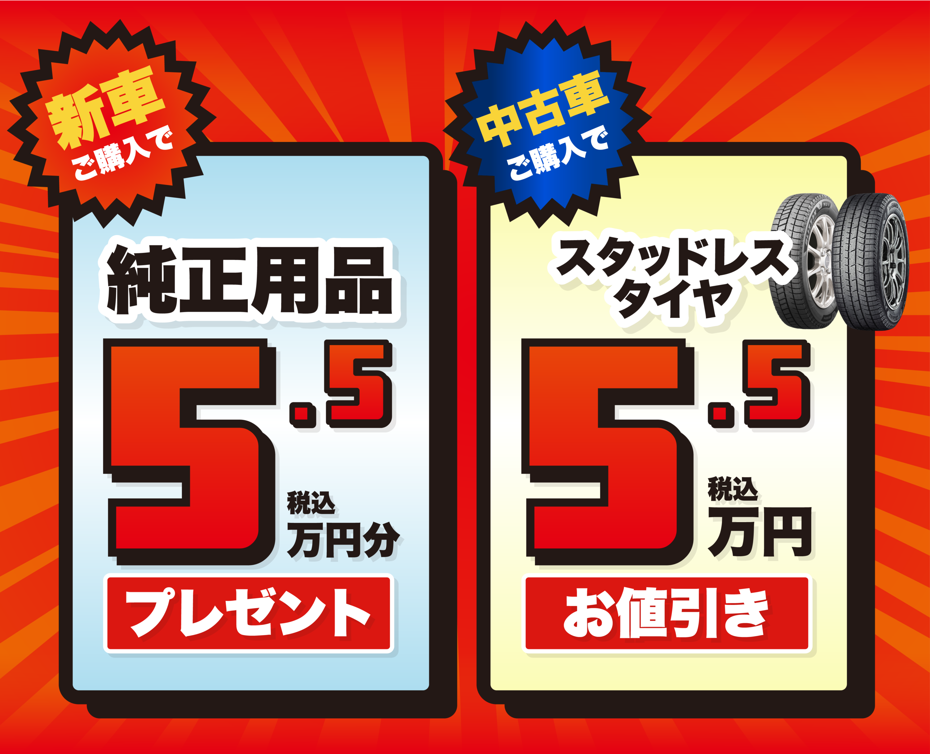 - 2026年2月7日~2026年2月15日までに、車両本体価格550,000円(税込み)以上の中古車とワンダフルパスポートご加入の上、2026年3月31日までに登録・届出いただくことを条件に55,000円(消費税込み)分を購入サポートとして割引いたします。