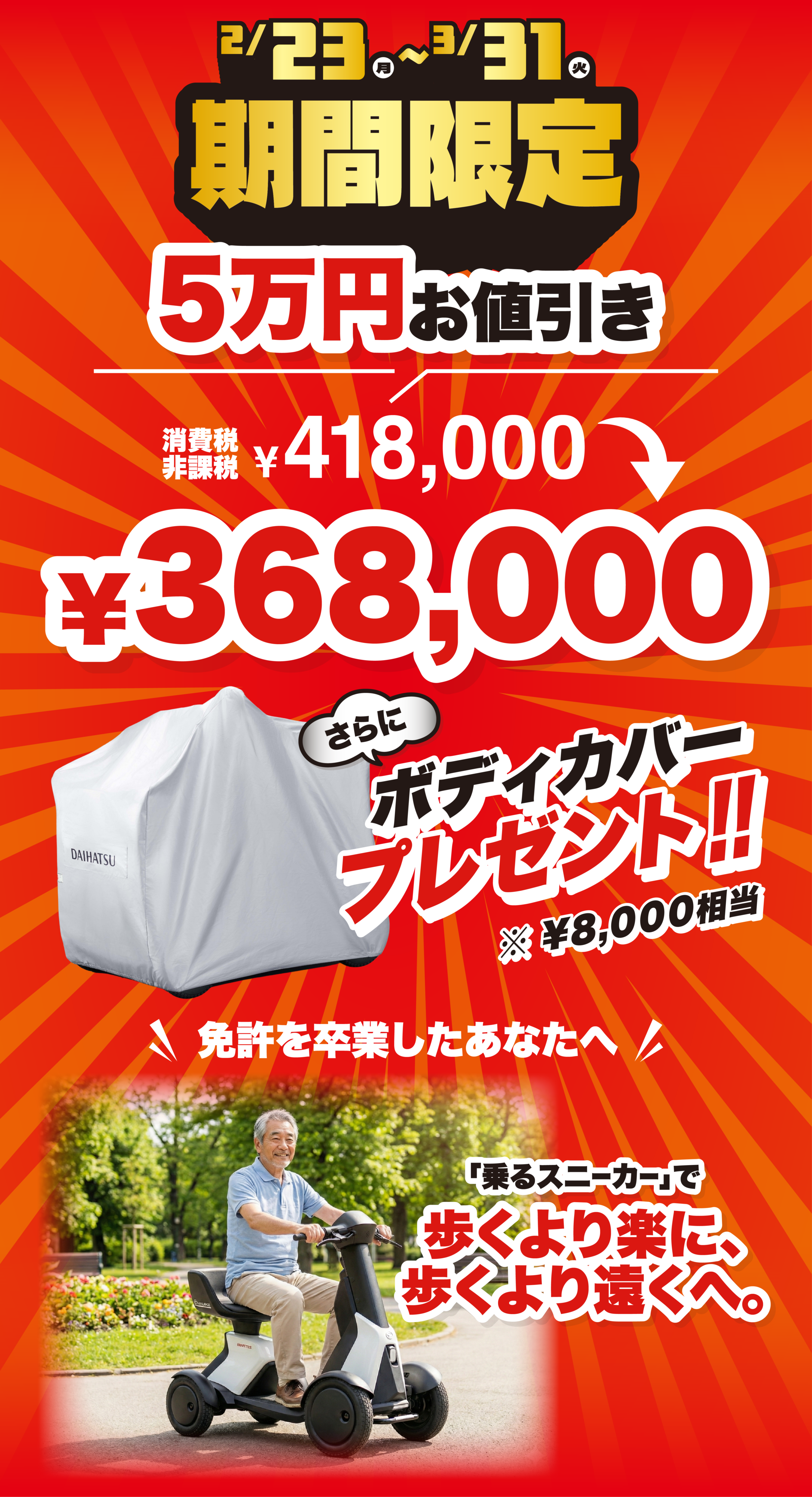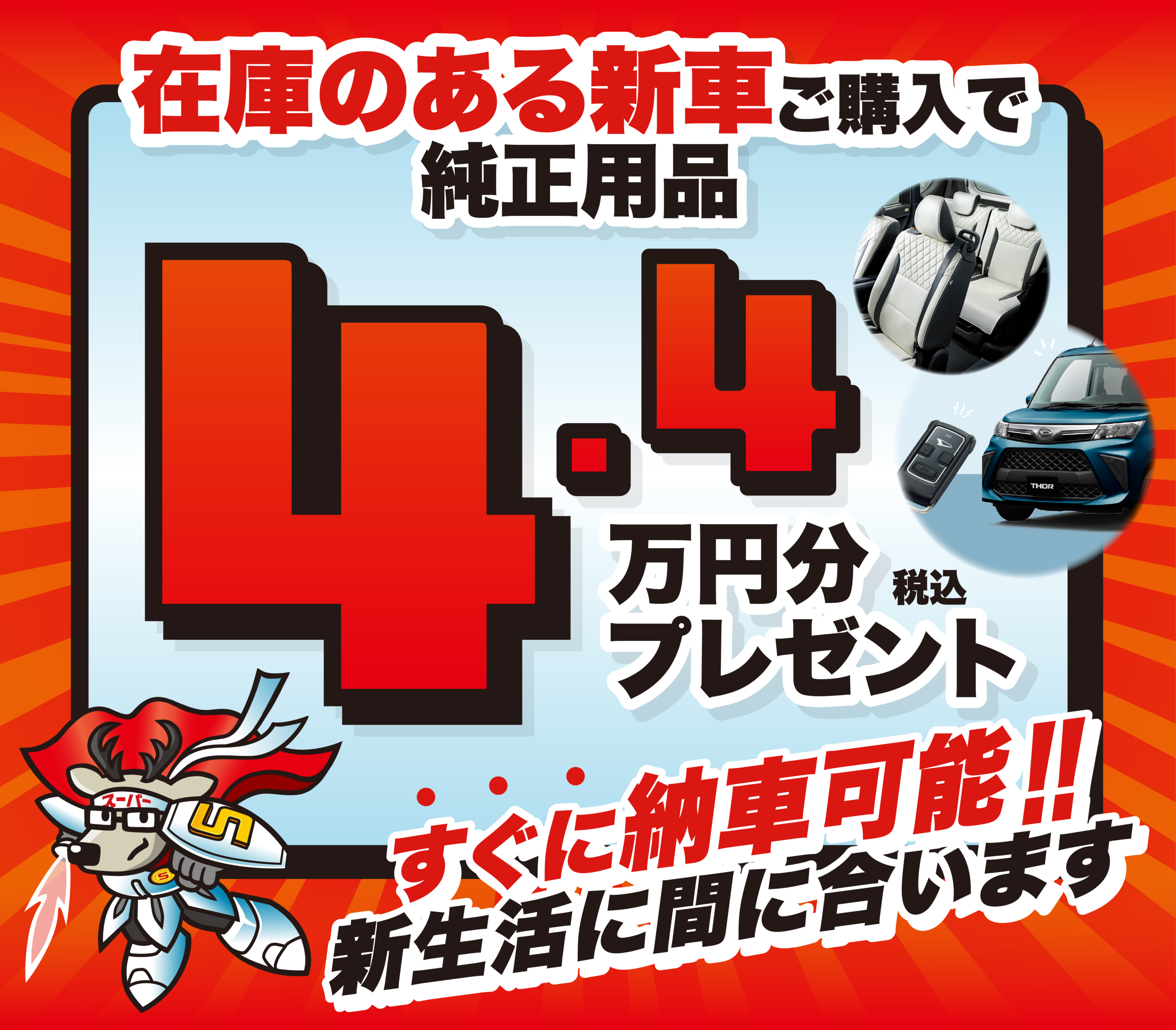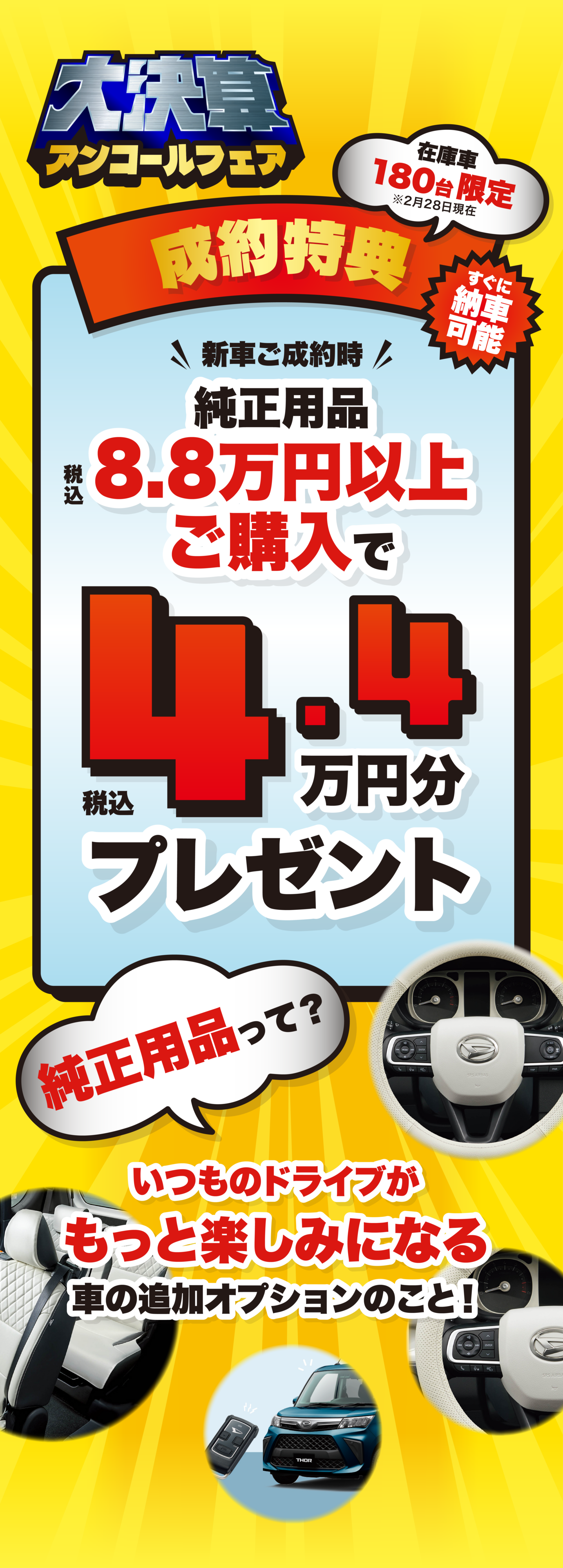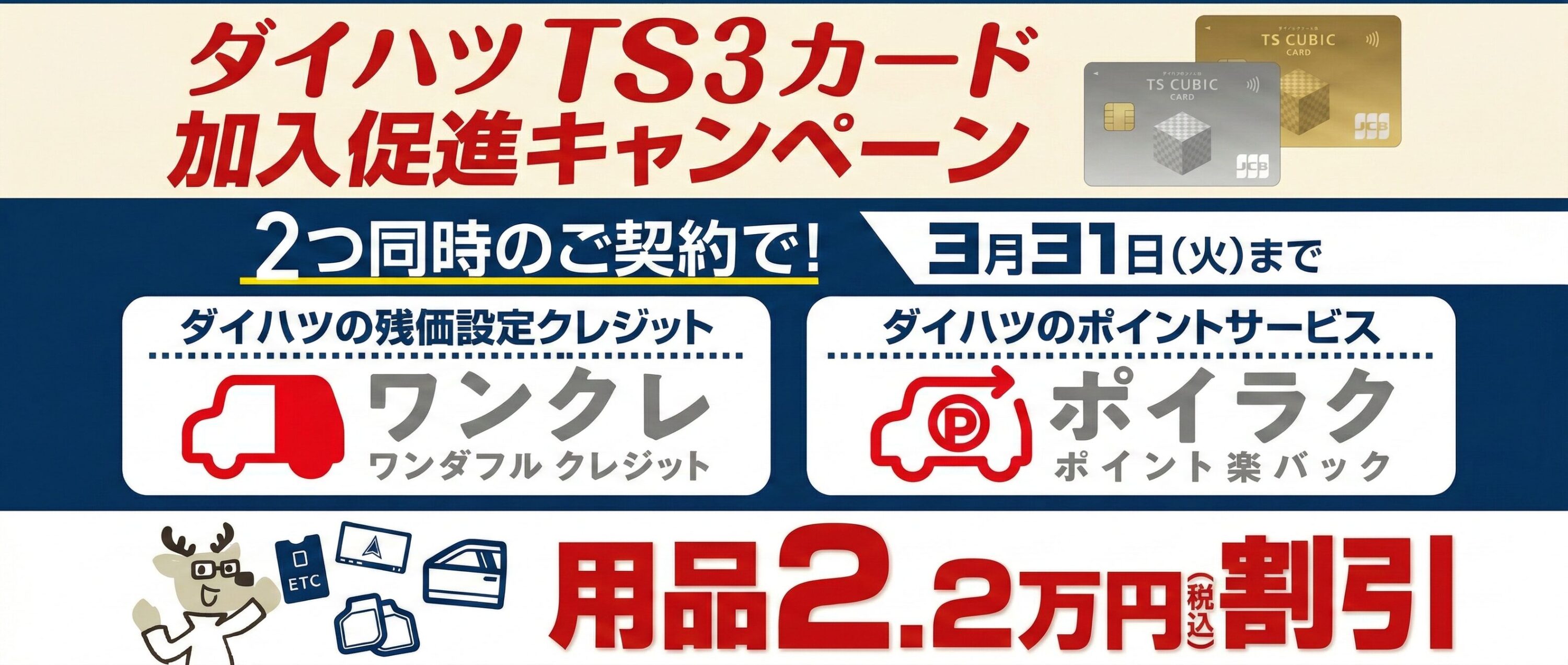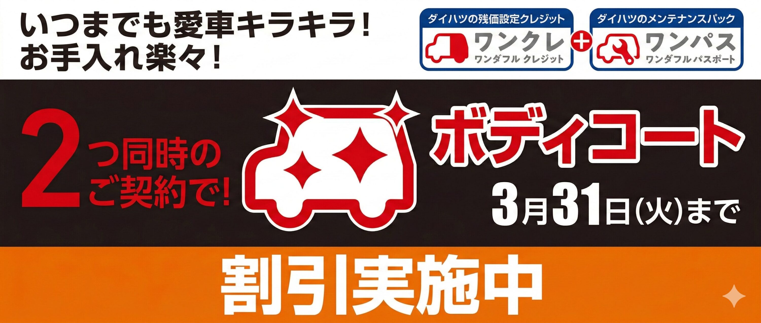 - 2026年2月18日~2026年3月22日までに、ダイハツ新車と用品88,000円(取付費・消費税込み)分、ワンダフルパスポートをセットでご成約の上、2026年3月31日までに登録・届出(ナンバー取得)を完了させることを条件に44,000円(消費税込み)を割引いたします。