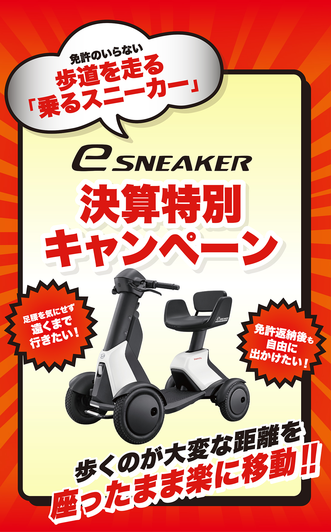 - e-SNEAKERは自賠責保険のないモビリティのため、ご購⼊にあたり、もれなく任意保険にご加入ください。万が一の事故に備え、補償・サービスが充実した『e-SNEAKER安心プラン』をご⽤意しております。また故障に備え、メーカー保証終了後も安心な『e-SNEAKER延長保証プラン』への加入もご検討ください。